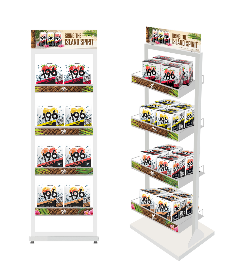Designed specifically for the Hawaiian market for Suntory Global Spirits, this localized retail activation unified the visual identities of -196 and On The Rocks cocktails to drive impulse purchases. Leveraging a vibrant tropical aesthetic featuring tiki motifs and lush flora, I conceptualized and rendered a cohesive suite of POS materials based on existing display structures. The comprehensive scope covered the entire creative pipeline, from initial master visual creation and graphic adaptation of structural panels to the final high-fidelity 3D visualization required for client buy-in.